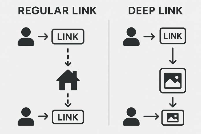- لینکسازی معمولی: یک لینک معمولی، شما را به صفحه اصلی یک وبسایت (مثلاً www.example.com) یا صفحه اصلی یک اپلیکیشن (پس از باز کردن آن) هدایت میکند. کاربر برای رسیدن به محتوای مورد نظر خود باید از ابتدا شروع به جستجو و پیمایش کند.